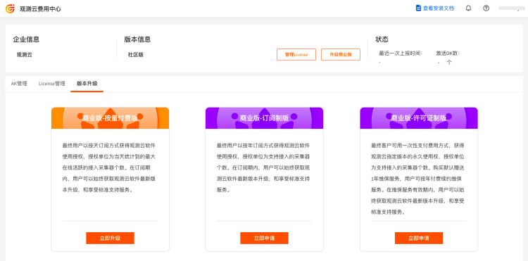 观测云社区版可以通过版本升级的方式,升到商业部署版。商业部署版是通过订阅或购买许可证的方式,获得观测云平台本地安装包和授权许可,来打造您的专属版观测云。在服务期内,观测云将持续提供升级包和在线支持服务,保障您的平台可以升级到最新版本。