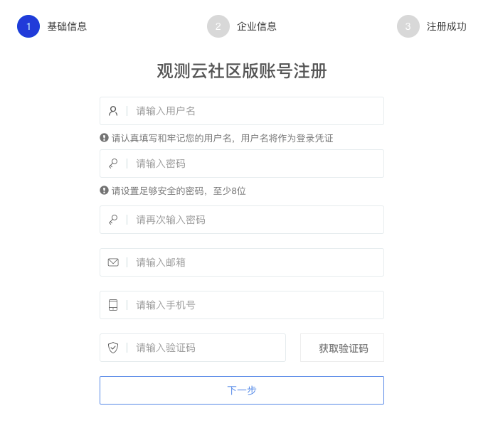 方式2:或者直接打开社区版注册地址(https://boss.guance.com/index.html#/signup?type=community),根据提示注册社区版账号。