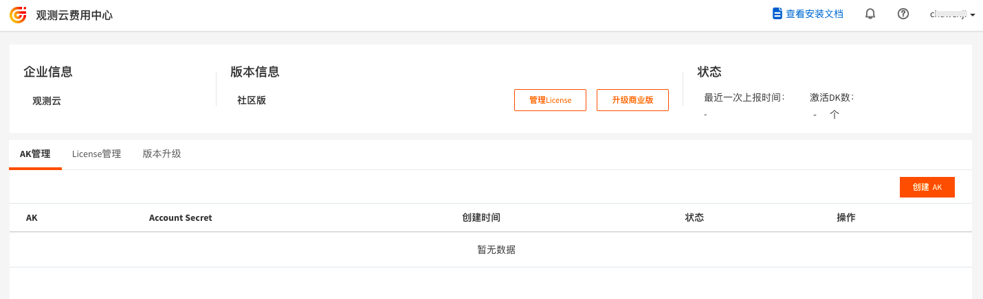 在观测云社区版费用中心的“AK 管理”,点击“创建 AK”,创建的 AK 和 SK复制后可填入“Step4:激活社区版”的 AK 和 SK 中。