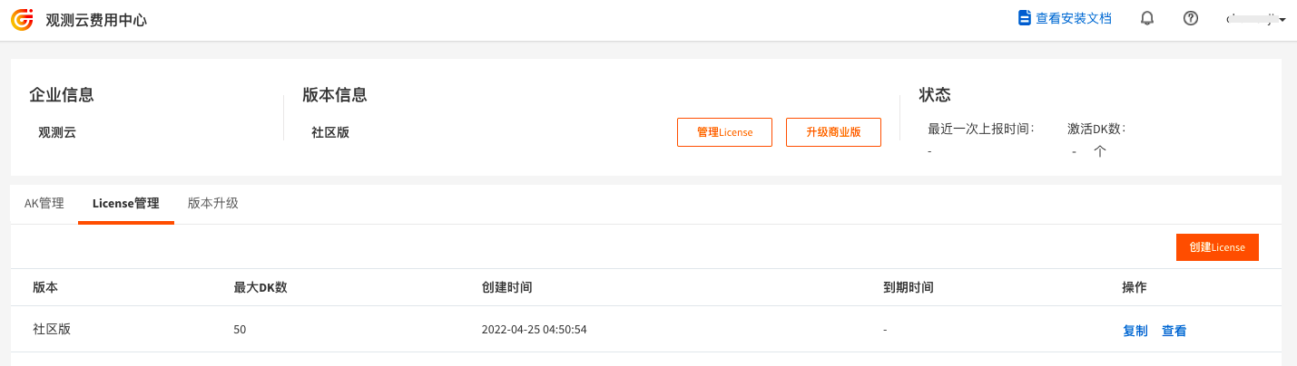 在观测云社区版费用中心的“License 管理”,点击“创建 License”,创建 License 时需要同意社区版用户许可协议并通过手机验证。创建的 License 复制后可填入“Step2:激活社区版”的 License 文本中。