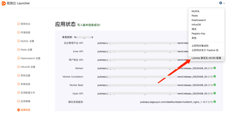 通过以上步骤,获取到 License、AK/SK 后,打开观测云 Launcher,点击右上角“设置”中的“License 激活及 AK/SK 配置”菜单: