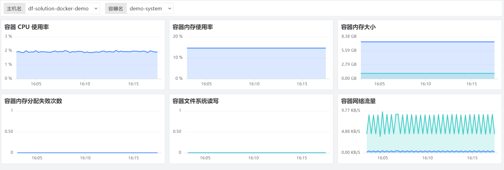 Docker 性能指标展示,包括 CPU 使用率、内存使用率、内存可用总量、容器网络流量、容器文件系统读写等。